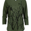 5.9 oz, 100% Cotton Slub Jersey. Features include a scoop neck, ¾ length sleeve, curved hi-lo hem line (back is longer than the front).
