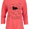 5.9 oz, 100% Cotton Slub Jersey. Features include a scoop neck, ¾ length sleeve, curved hi-lo hem line (back is longer than the front). Our Slub fabric is thicker with slightly raised threads giving the fabric a textured look and feel. Tear away label. Ladies Relaxed Loose fit.