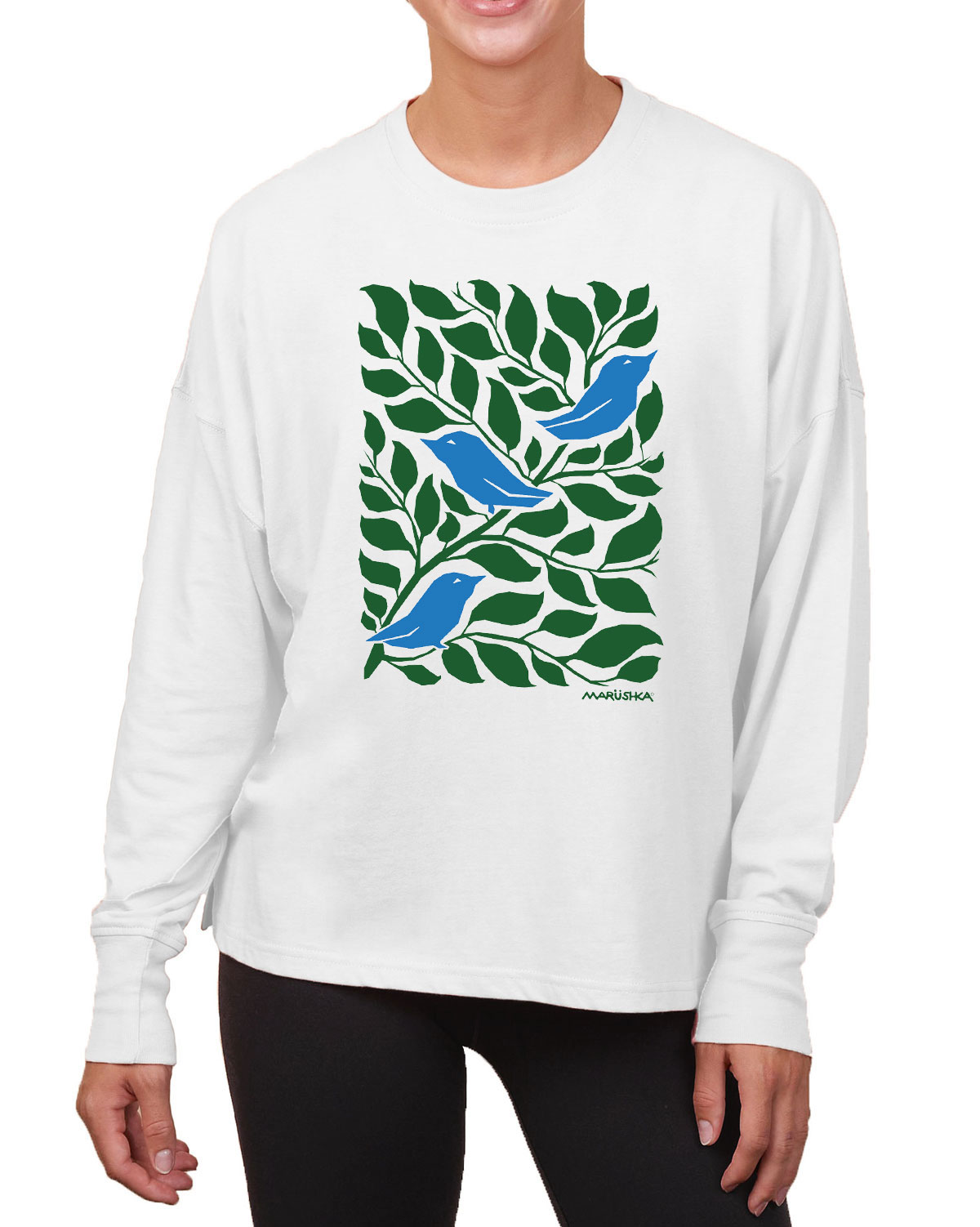 Boxy Long Sleeve Tee 3 Birds (Green & Blue on Linen)