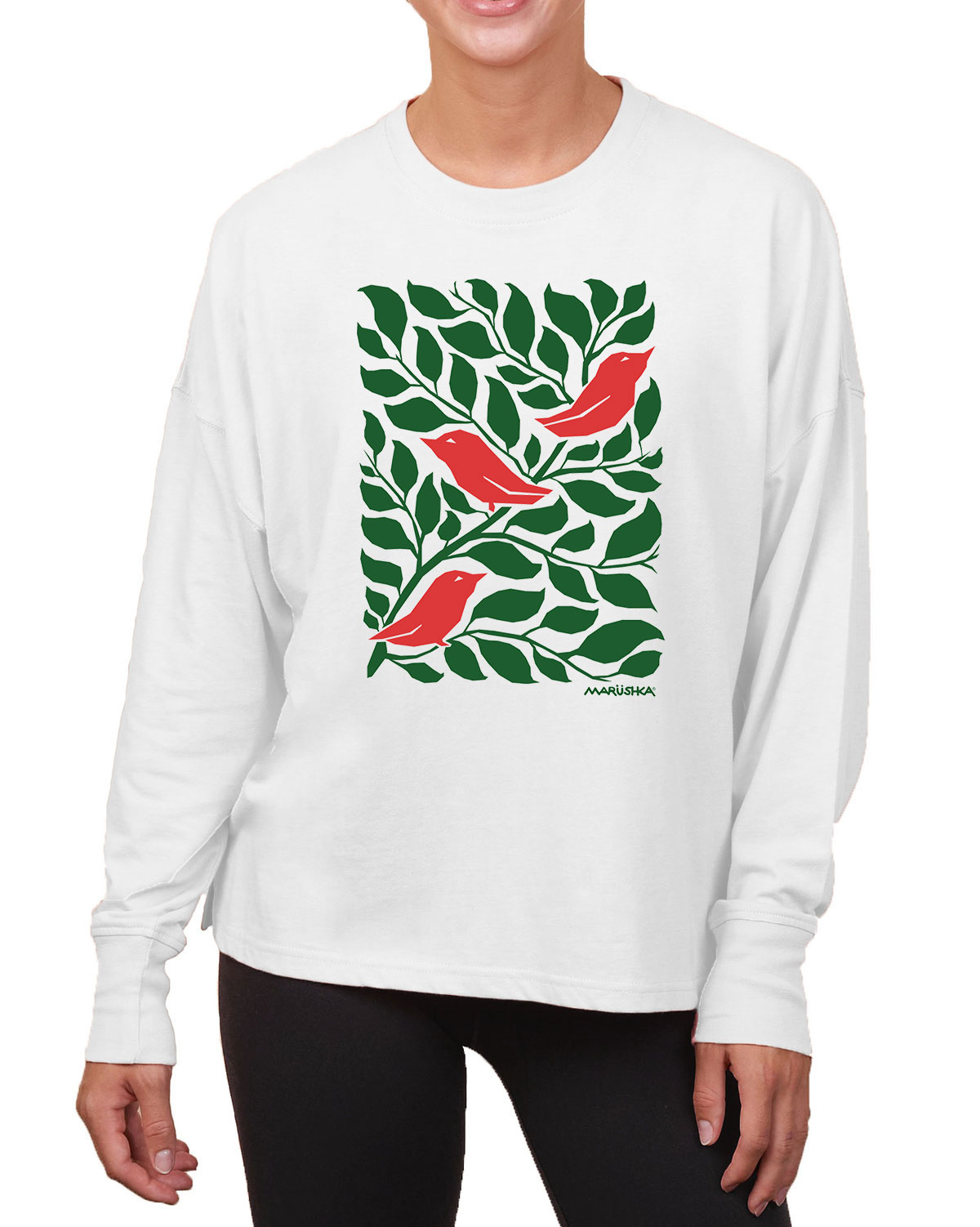 Boxy Long Sleeve Tee 3 Birds (Green & Red on Linen)