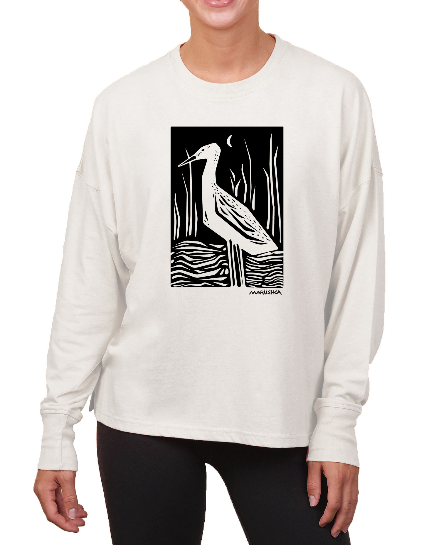 Boxy Long Sleeve Tee Marsh Birds (Black on Linen)