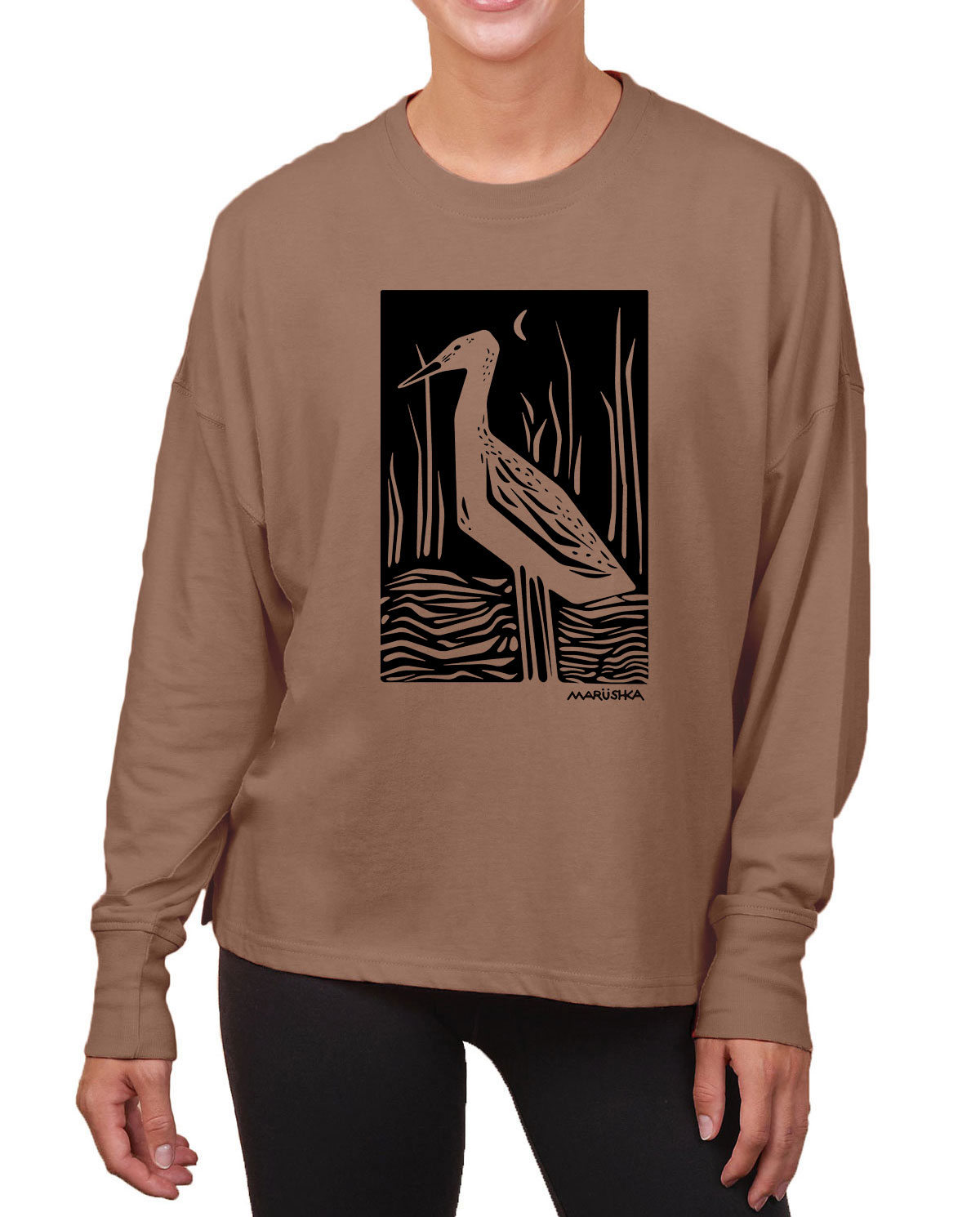 Boxy Long Sleeve Tee Marsh Birds (Black on Taupe)