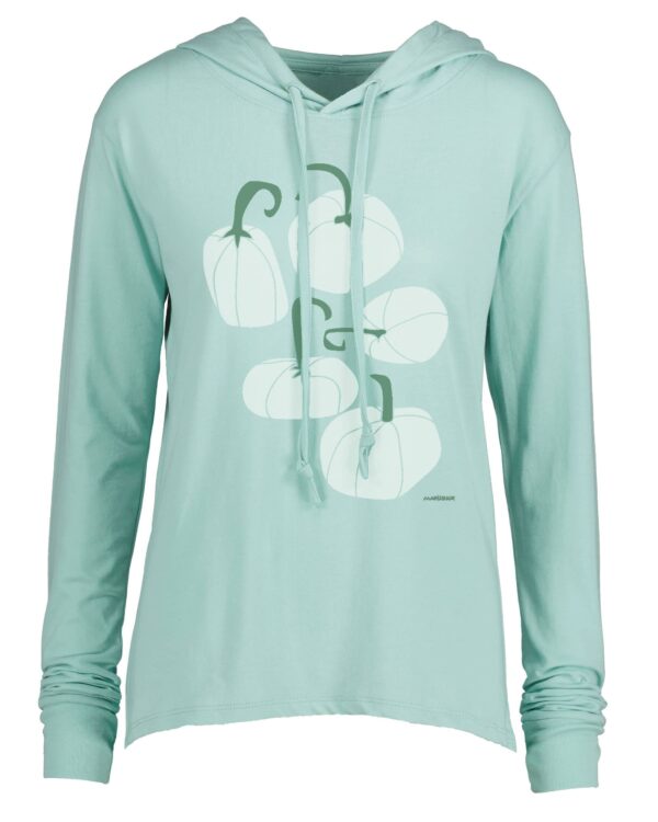 This Women’s Long Sleeve Hooded T is great for any occasion or simply lounging at home. 4.5 oz., 60% cotton 40% polyester. Features include a self-fabric hood and drawstring with knotted ends. High-low sweep (back longer than front) with 1X1 rib cuff .