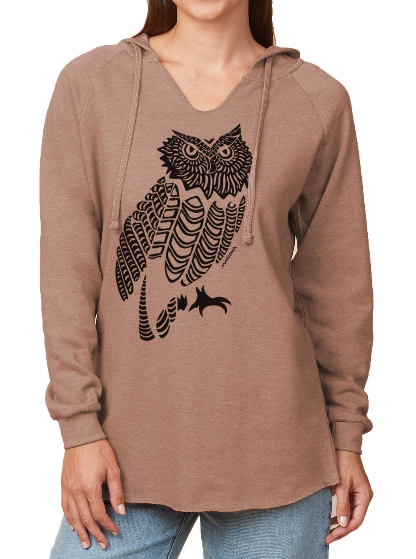 Notch Neck Hoody Owl (Black on Taupe)