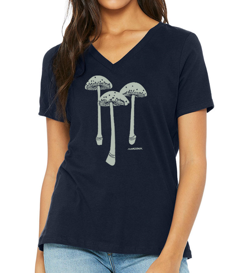 Relaxed V Neck 3 Mushrooms (Natural on Navy)