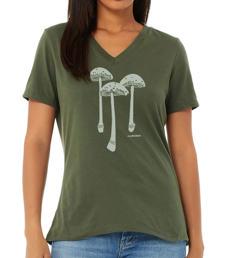 Relaxed V Neck 3 Mushrooms (Natural on Olive)
